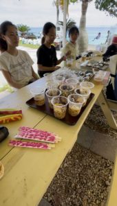 綺麗な海津堅島で途中ビーチを子供達と走ってみたり皆それぞれ楽しみながらビーチクリーンしてました。昼食は手作りのポークたまごと冷やしソーメンと麦茶、愛情たっぷりの昼食を提供して頂き、ポー玉と冷やしソーメンの組み合わせの美味しさに皆感動でたくさん食べましたよ!