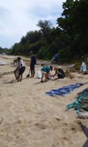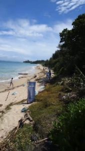 到着すると、コバルトブルーのジープで神谷荘全員でお出迎えして頂き、神谷荘の目の前トゥマイ浜まで送迎して頂きました。神谷荘さんとマリン業者のBlueStyleさん達と皆でビーチの端から端まで、ビーチクリーンスタート。